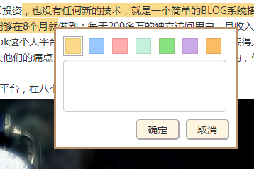 这里要说一下 rangy.js 的文档(https://code.google.com/p/rangy/),看我的头晕脑胀,每一句都超长,包含很多 whether,with,that,and,or 等词语,让我这种英语很差的人十分头疼(正常人会说:“我吃了点饭”,不正常的人会说:“我倒也不是没吃”),常常看到后半句的时候已经忘了前半句在说什么了…但是 rangy.js 的功能还是比较强大的,除了核心库之外,还提供了几个插件来实现更具体的功能。下面是我需要实现的效果: