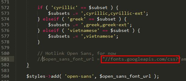 另外在替换的时候,发现 wordpress 的后台居然也有 Google 的这个字体,导致后台访问奇慢,一番搜索之后找好了屏蔽方法,在/wp-includes/script-loader.php 文件中,如下: