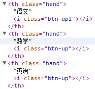 <tr> <th class="hand active">语文<i class="btn-up"></i></th> <th class="hand">数学<i class="btn-up"></i></th> <th class="hand">英语<i class="btn-up"></i></th> </tr>