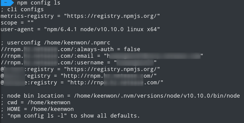 登录完成之后,执行 npm config ls 就可看到具体的 npm 设置: