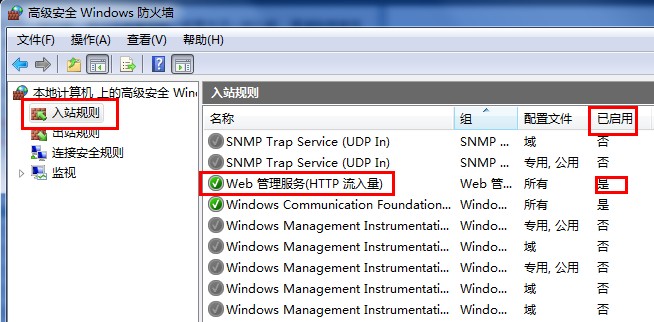 打开“控制面板 – Windows 防火墙 – 高级设置”,在“入站规则”中打开“Web 服务器(HTTP 流入量)”,“万维网服务(HTTP 流入量)”,“万维网服务(HTTPS 流入量)”。