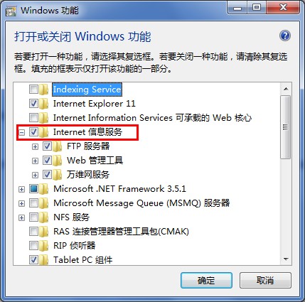 打开“控制面板 – 程序和功能 – 打开或关闭 Window 功能”,勾选“Internet 信息服务”(具体根据自己的需要选择,如果电脑性能好又懒得查,可以全部选上,这块就不细说了),点击确定,然后会安装 IIS。(其他的系统可以单独下载安装)