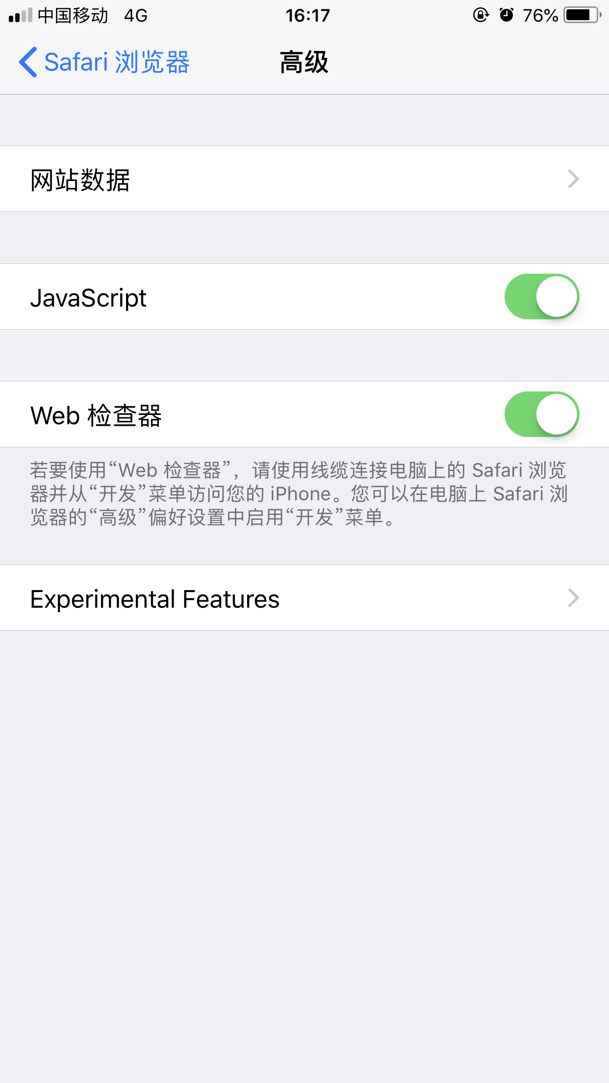 iphone 上打开设置 - Safari 浏览器 - 高级:开启 Web 检查器