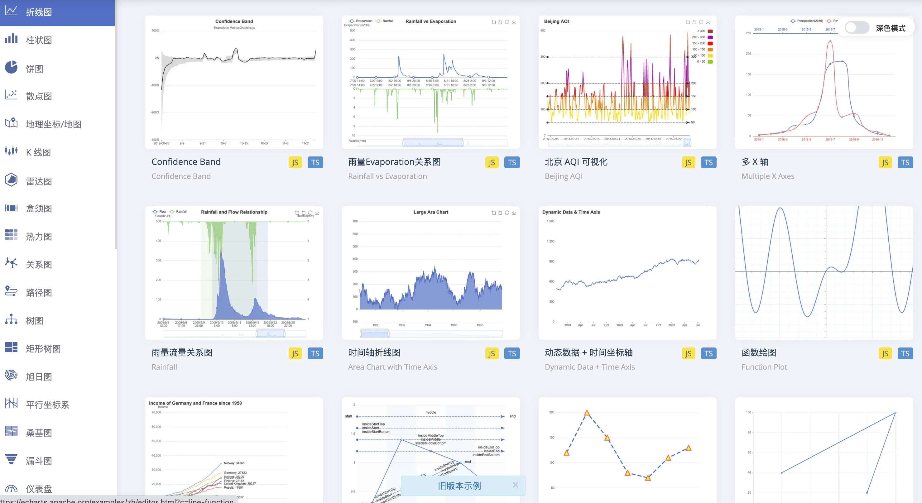 图表方面我暂时没找到特别好用的软件,折线图、饼图、柱状图、雷达图等有很多种展现形式,开发这类型工具的复杂度肯定是比较高的,操作难度应该也不会小,所以我选择直接使用 Echarts,它的在线示例和 API 文档都非常完善。
