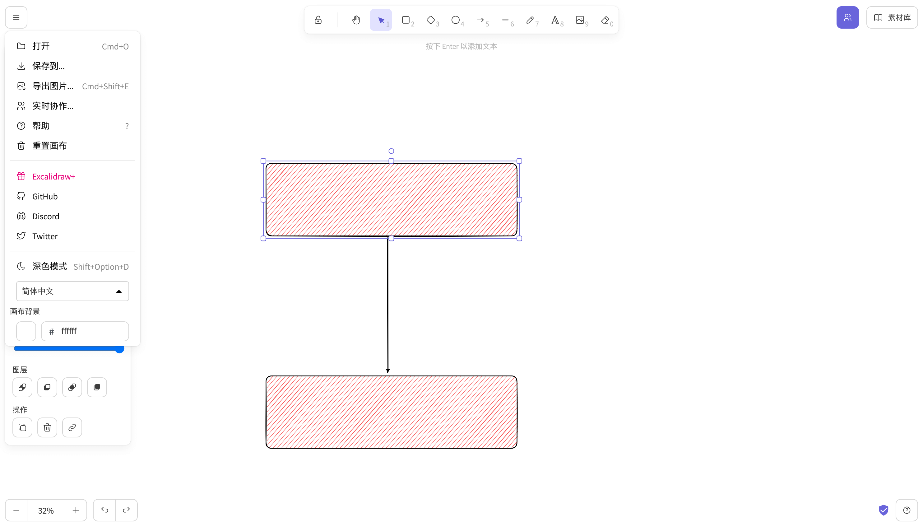 但是功能上不如 diagrams.net 全面。比如两个元素的对齐,需要同时选中然后在面板里(快捷键)操作;再比如连线,没有默认的锚点,「过于自由」了。当然了,Excalidraw 功能上的亮点还未深入探索,短暂的体验还是给我留下很好的印象的,看好它的未来发展。
