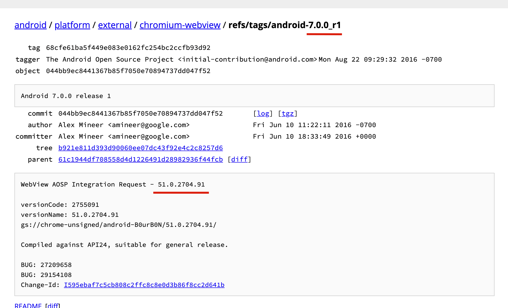 我大概翻了翻 Android 源码,把主要大版本对应的初始 WebView 捞了出来,供大家参考。理论上讲,用户的 WebView 版本应该“只大不小”,我的三星手机升级 One UI 5、Android 13,自带的版本就已经是 104.0.5112.97 了。
